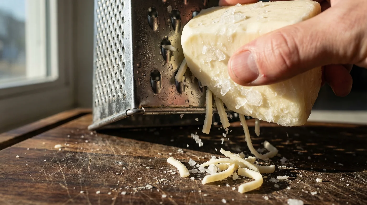 • Symptom: Oily residue left on the cutting board and hands. Cause = Ambient kitchen heat, especially when the oven is preheating, is actively separating the lipids from the moisture content before grating even begins.