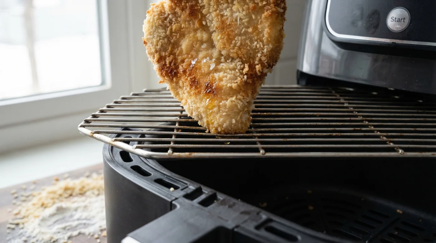 - Symptom: A pale, mushy underside on breaded chicken or pork chops. Cause: Steam pooling in the deep, unventilated corners of the enclosed basket.