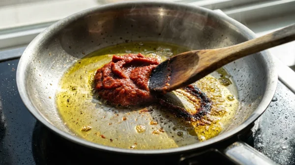 - Tomato Paste Must Fry In Olive Oil Before Adding Liquids